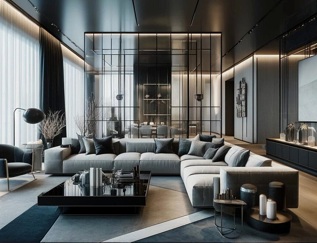İşte modern iç mimariye uygun şık ve sofistike bir tasarıma sahip modern bir oturma odası. Mekanda cam, metal ve ahşap gibi malzemelerin bir karışımı yer alıyor.