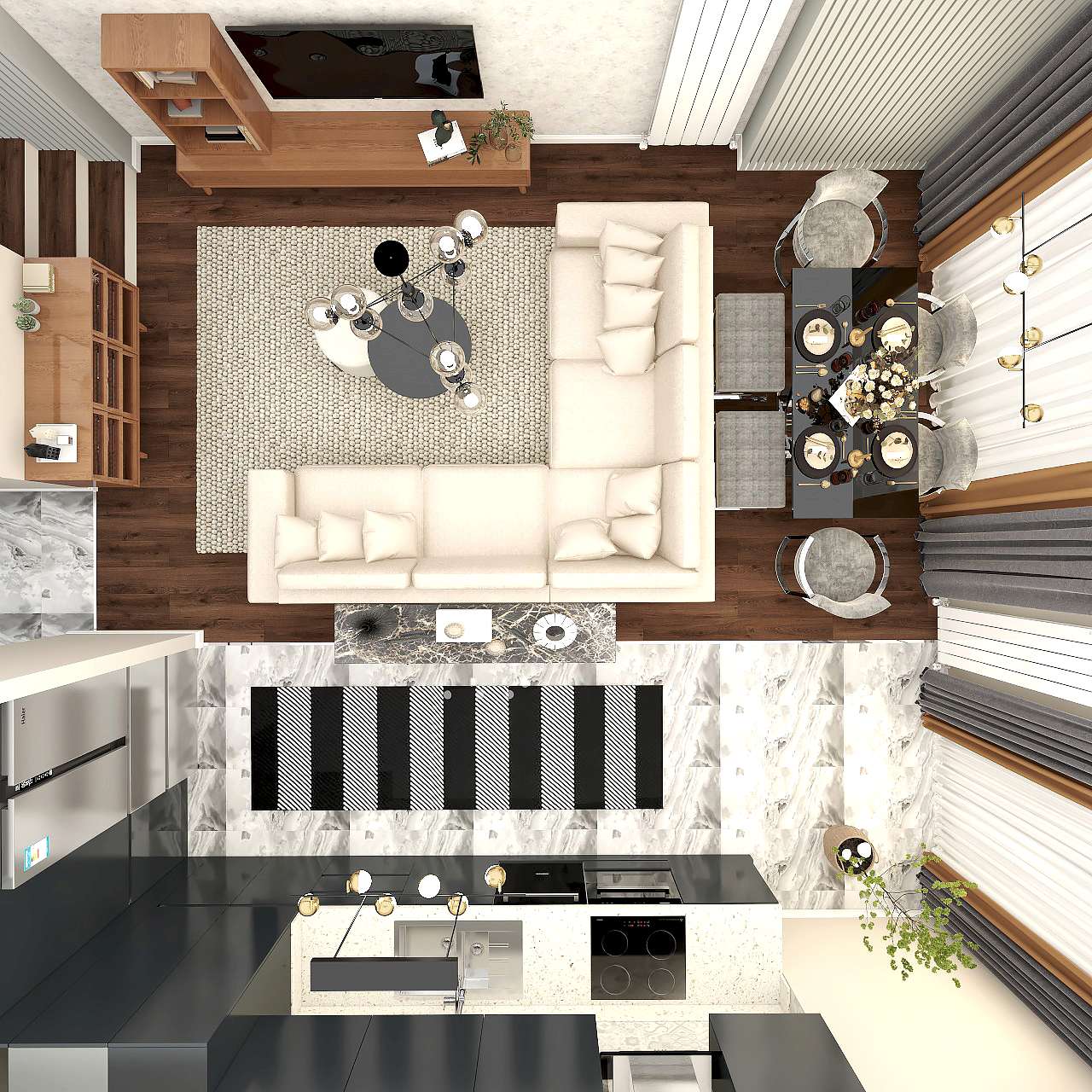 • Yapay zeka kullanılarak minimalist bir estetikle tasarlanmış, doğal malzemeler ve sıcak aydınlatmalar içeren şık bir yaşam alanı.