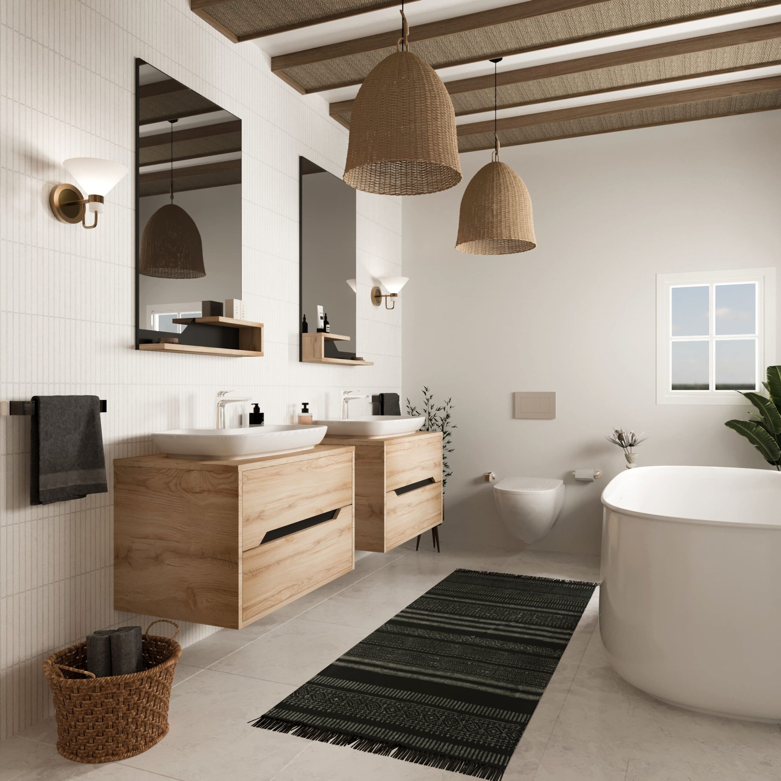 BANYO TASARIMI, mermer duvarlar, çift lavabo, büyük aynalar ve gri yüzen bir dolapla modern bir banyo sergiliyor. Ünlü bir iç mimar tarafından tasarlanan villa tarzı mekan, dolabın önündeki halıya sıcak bir ışık veren yumuşak bir aydınlatmaya sahip.